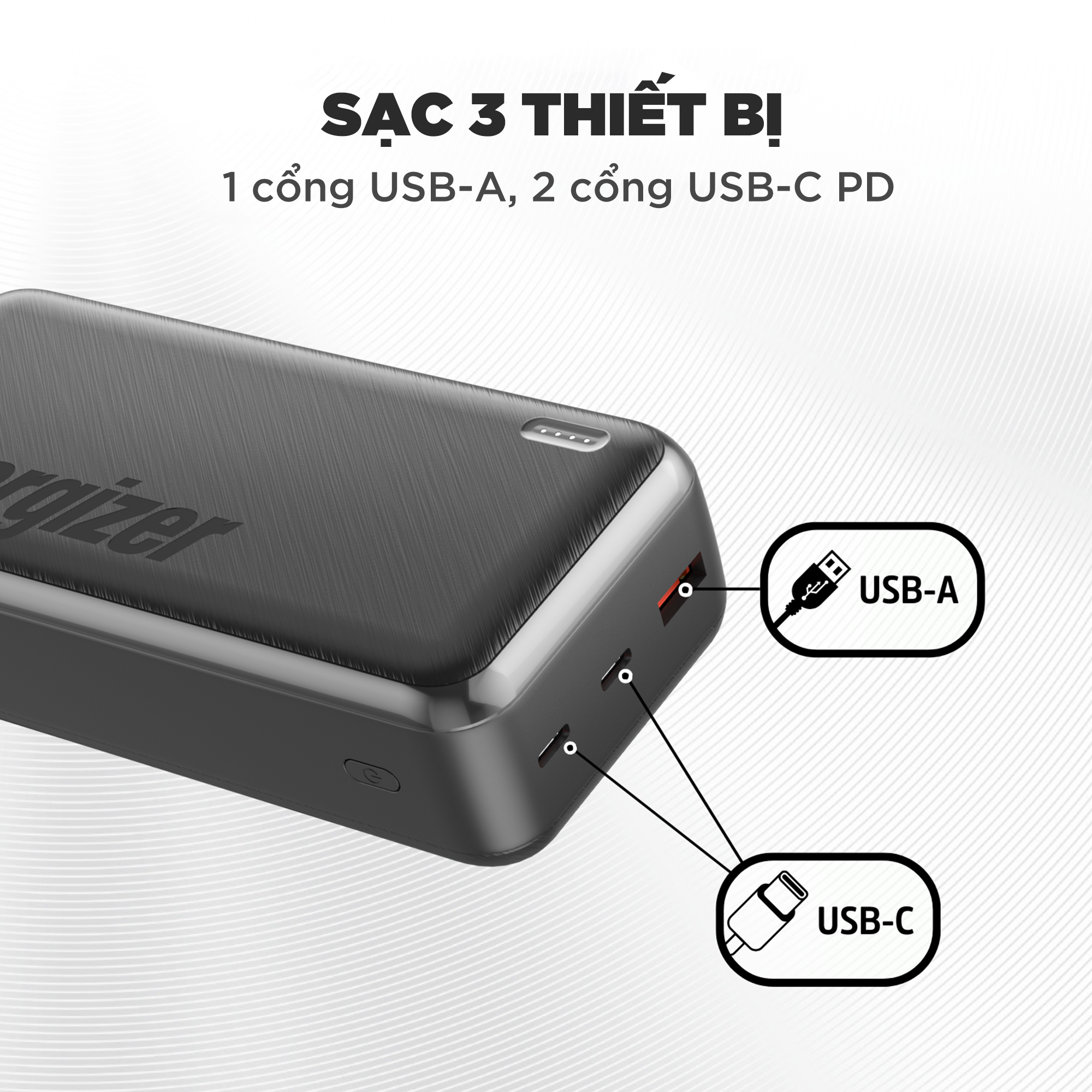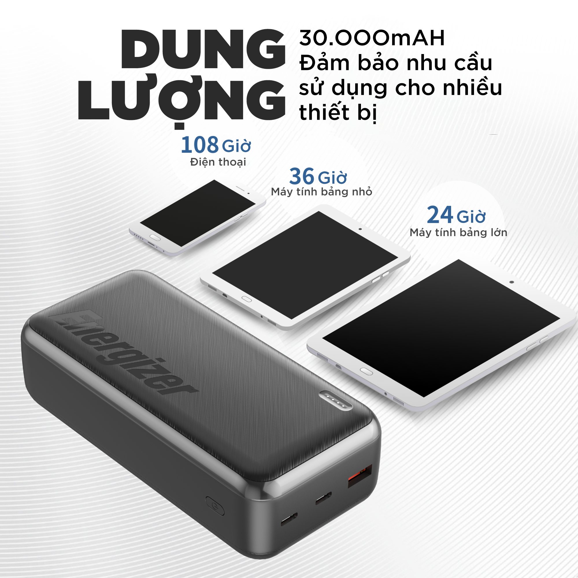 Energizer UE30055PQBK là dòng pin sạc dự phòng dung lượng lớn 30.000mAh, thiết kế sang trọng, chắc chắn và hiệu suất cao. Với công nghệ sạc nhanh Power Delivery (PD) và Quick Charge (QC 3.0), sản phẩm giúp sạc nhanh cho điện thoại, máy tính bảng, tai nghe và nhiều thiết bị khác một cách an toàn và hiệu quả.