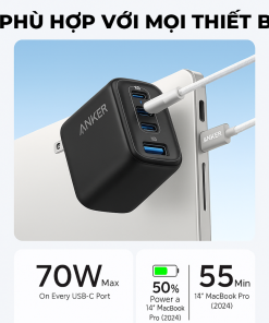 Ba cổng USB-C cho phép sạc nhanh các thiết bị như MacBook, tablet hoặc smartphone, trong khi cổng USB-A hỗ trợ thiết bị legacy hoặc phụ kiện. Tổng công suất tối đa 70W giúp bạn sạc laptop và các thiết bị đồng thời mà vẫn bảo đảm hiệu suất.