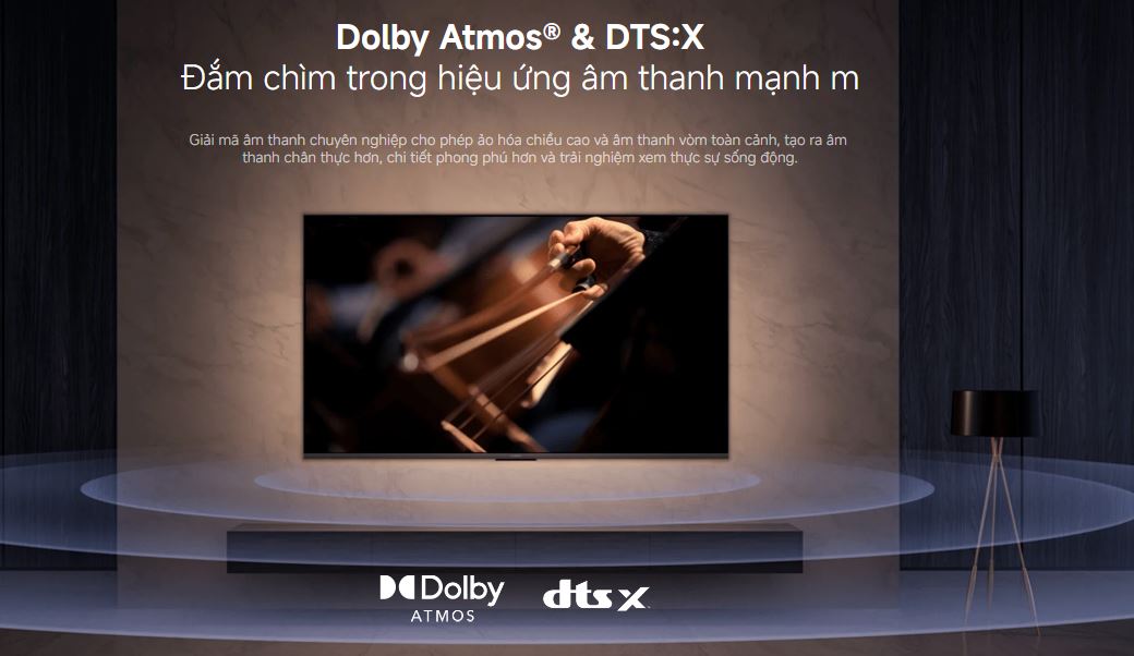 Công nghệ âm thanh vòm Dolby Atmos và DTS-HD giúp tạo không gian âm thanh 3D sống động, cho trải nghiệm như rạp phim thực thụ.