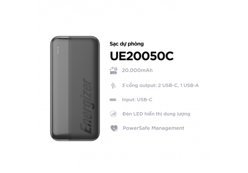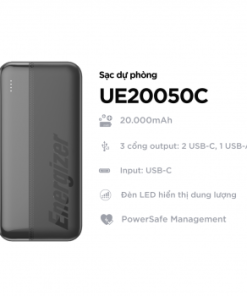 Pin sạc dự phòng Energizer UE20050 20000mAh là dòng pin dung lượng cao của thương hiệu Energizer nổi tiếng thế giới. Với thiết kế hiện đại, nhiều cổng sạc, dung lượng khủng và công nghệ bảo vệ an toàn PowerSafe, sản phẩm là lựa chọn lý tưởng cho những ai thường xuyên di chuyển, làm việc ngoài trời hoặc du lịch xa.