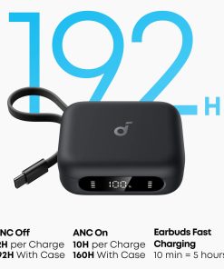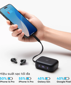 Về pin, Soundcore P41i cho thời gian nghe nhạc khoảng 10 giờ chỉ với tai nghe, và tổng cộng 40 giờ khi dùng cùng hộp sạc. Công nghệ sạc nhanh cũng rất tiện: chỉ 10 phút sạc là có thể dùng thêm khoảng 2 giờ.